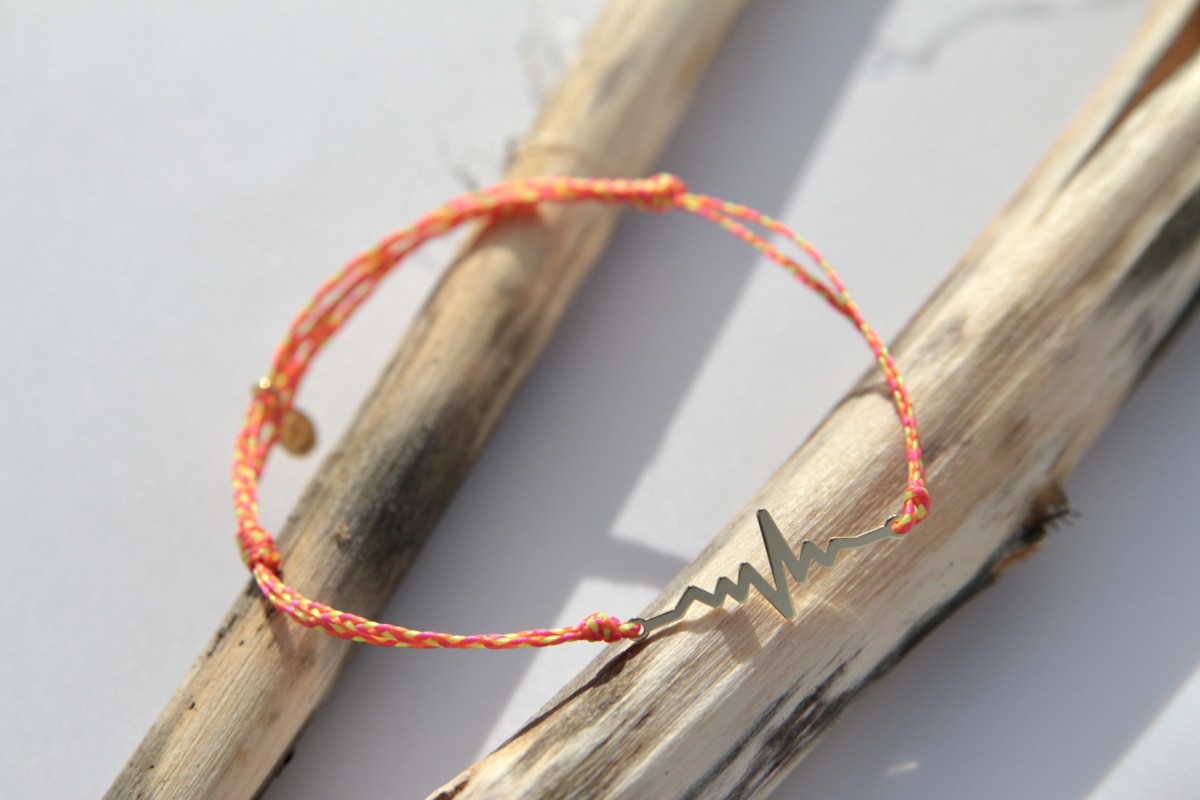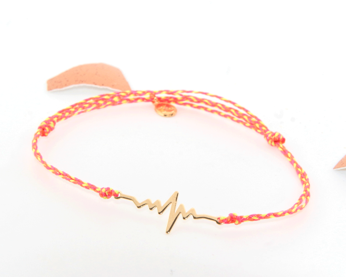 Pulse capture l’intensité d’un battement de cœur, le rythme d’une musique, l’énergie d’un instant. Sa ligne graphique en plaqué or 3 microns épouse délicatement le poignet, montée sur un fil coulissant tricolore orange, rose et jaune néon pour une touche vibrante et solaire. Un bijou fin et symbolique, à porter comme un rappel de ce qui fait vibrer.