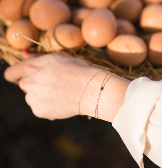 Livré dans un pochon, caché dans une coquille d'oeuf. Fabriqué dans nos ateliers.L'avis du poulailler : "Le cadeau deux en un parfait à utiliser en collier ou en bracelet"