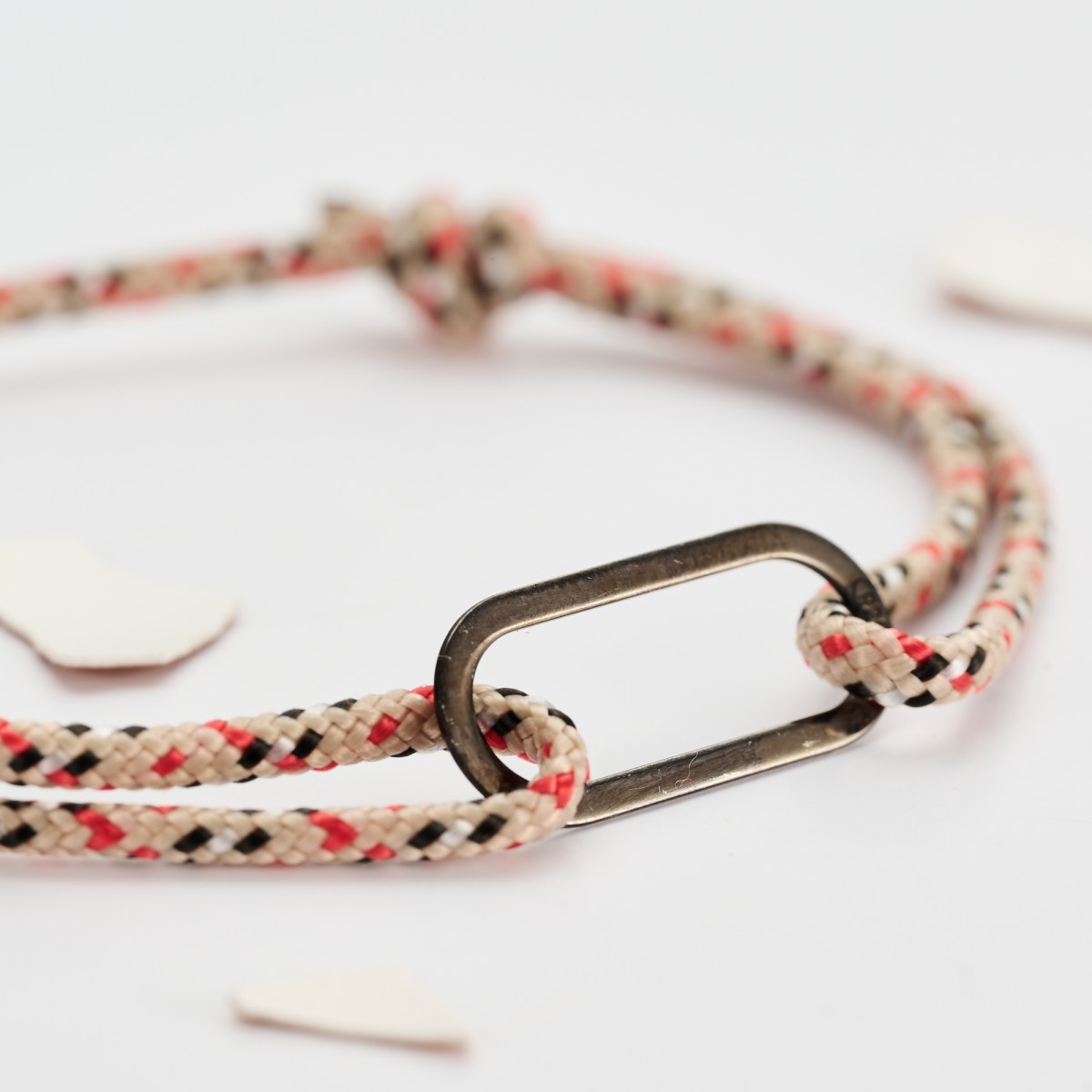 Bracelet coulissant homme PARA, en paracorde tartan beige, rouge et noir avec connecteur ovale 20 mm Rhodié noir.Fabriqué avec amour au poulailler et caché dans un oeuf de poule.