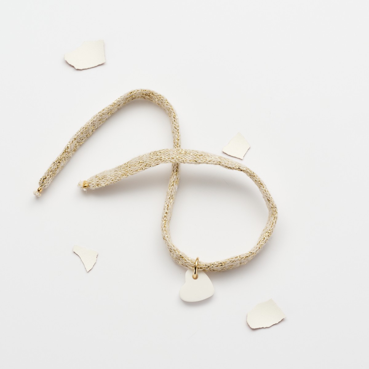 Bracelet à nouer en coton recyclé beige doré, avec pendentif cœur en argile polymère blanc.
