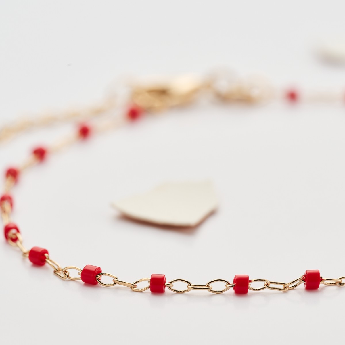 Bracelet plumetis en laiton doré 3 microns et perles Miyuki. Disponible en 3 couleurs : blanc, noir et rouge. Avec chaînette de rallonge. Caché dans une coquille d'oeuf.