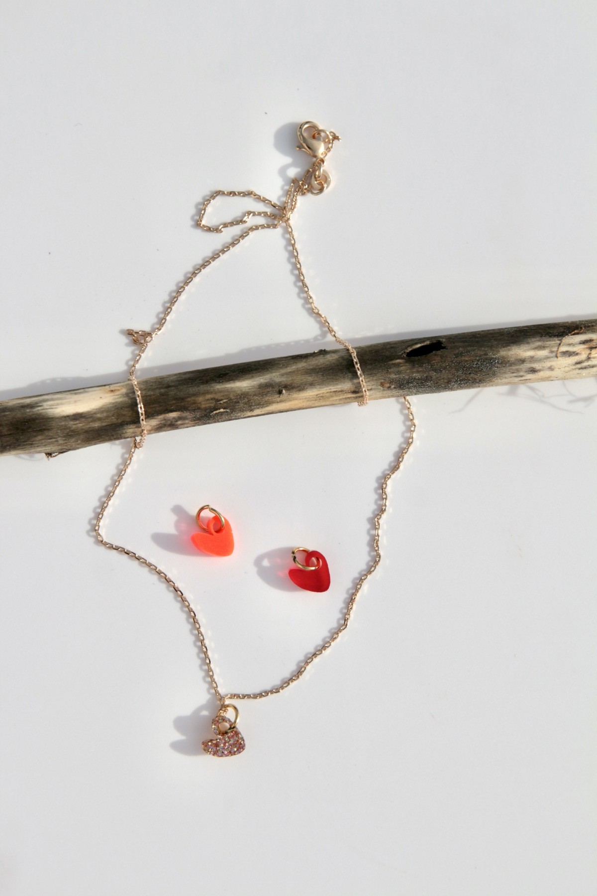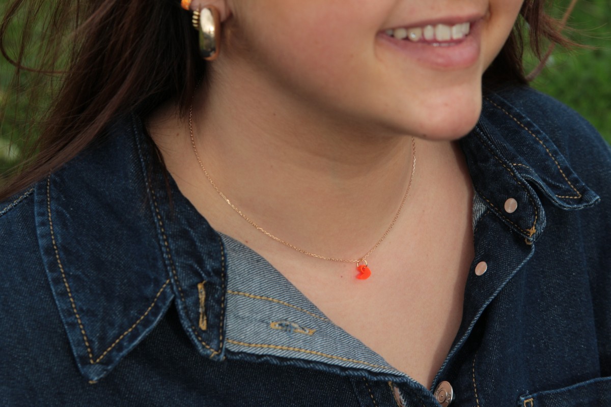La chaîne en plaqué or de 42 cm est accompagnée de trois pampilles cœur interchangeables aux couleurs vibrantes : orange fluo, rouge profond et rose gold.À porter selon l’humeur, la tenue ou l’occasion.
