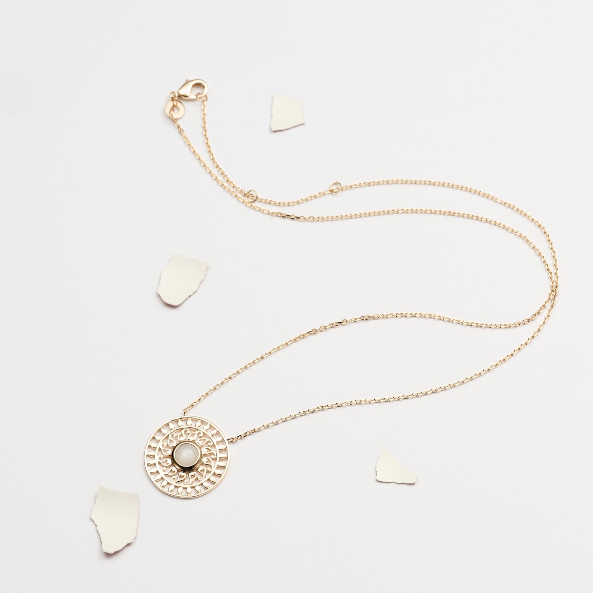 Collier en plaqué or 3 microns avec médaille soleil en pierre de lune.Longueur : 42cm.