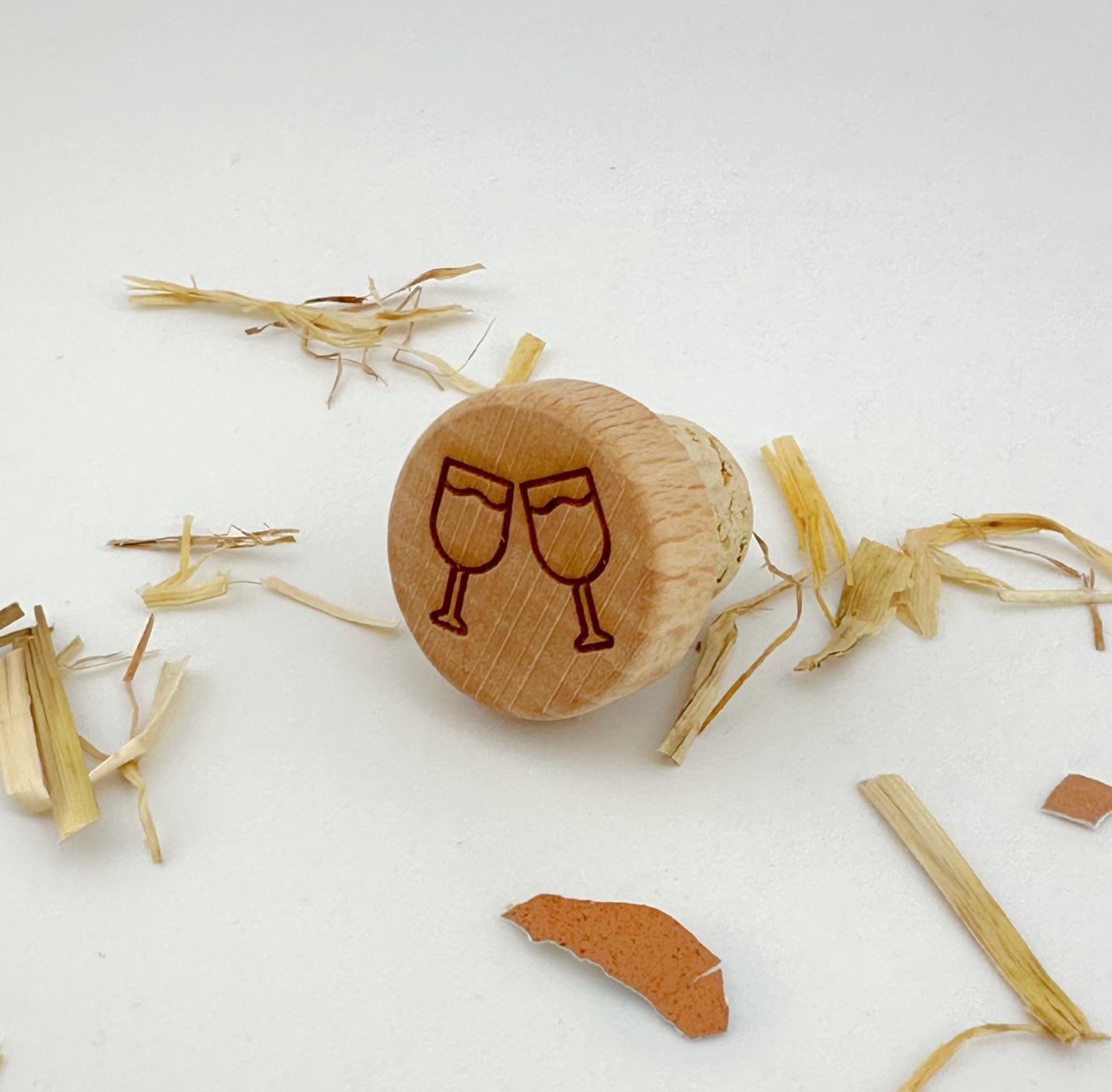 Nos bouchons sont issus des productions landaises, à quelques pas de l'atelier. Ils gravés par nos soins et cachés dans un oeuf de poule.