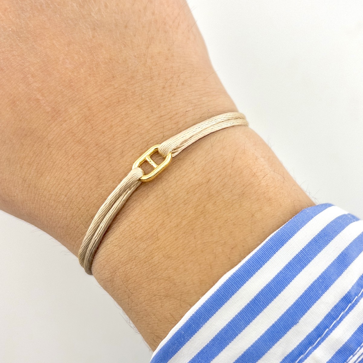 Le bracelet coulissant Mini Link, un bracelet en cordon Mokuba sable avec un connecteur en laiton doré 3 microns.